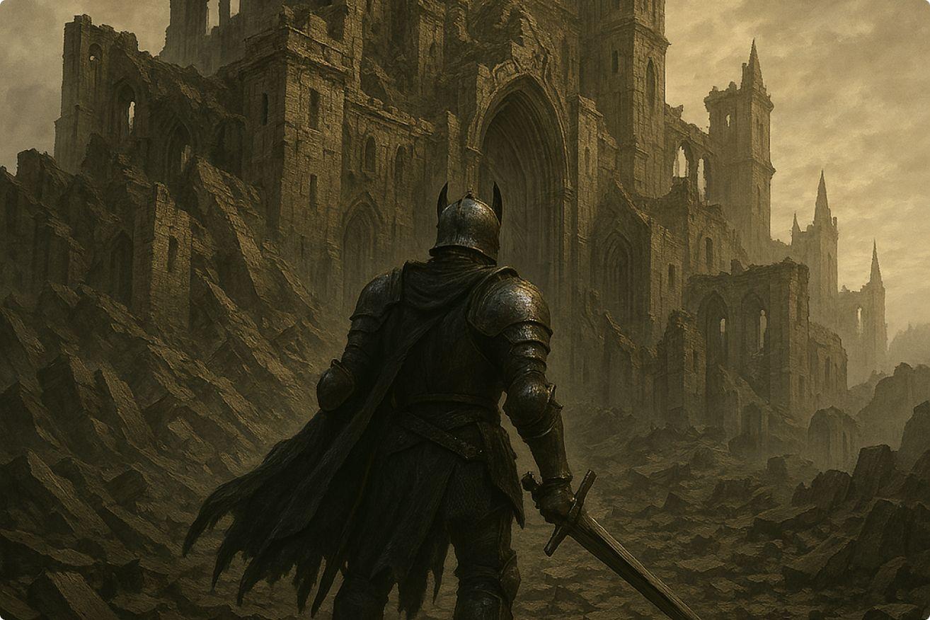 Prompt: A lone knight in dark armor standing before a shattered castle, dramatic cloudy sky, moody atmosphere, detailed textures, dark fantasy style, cinematic lighting, epic scale.