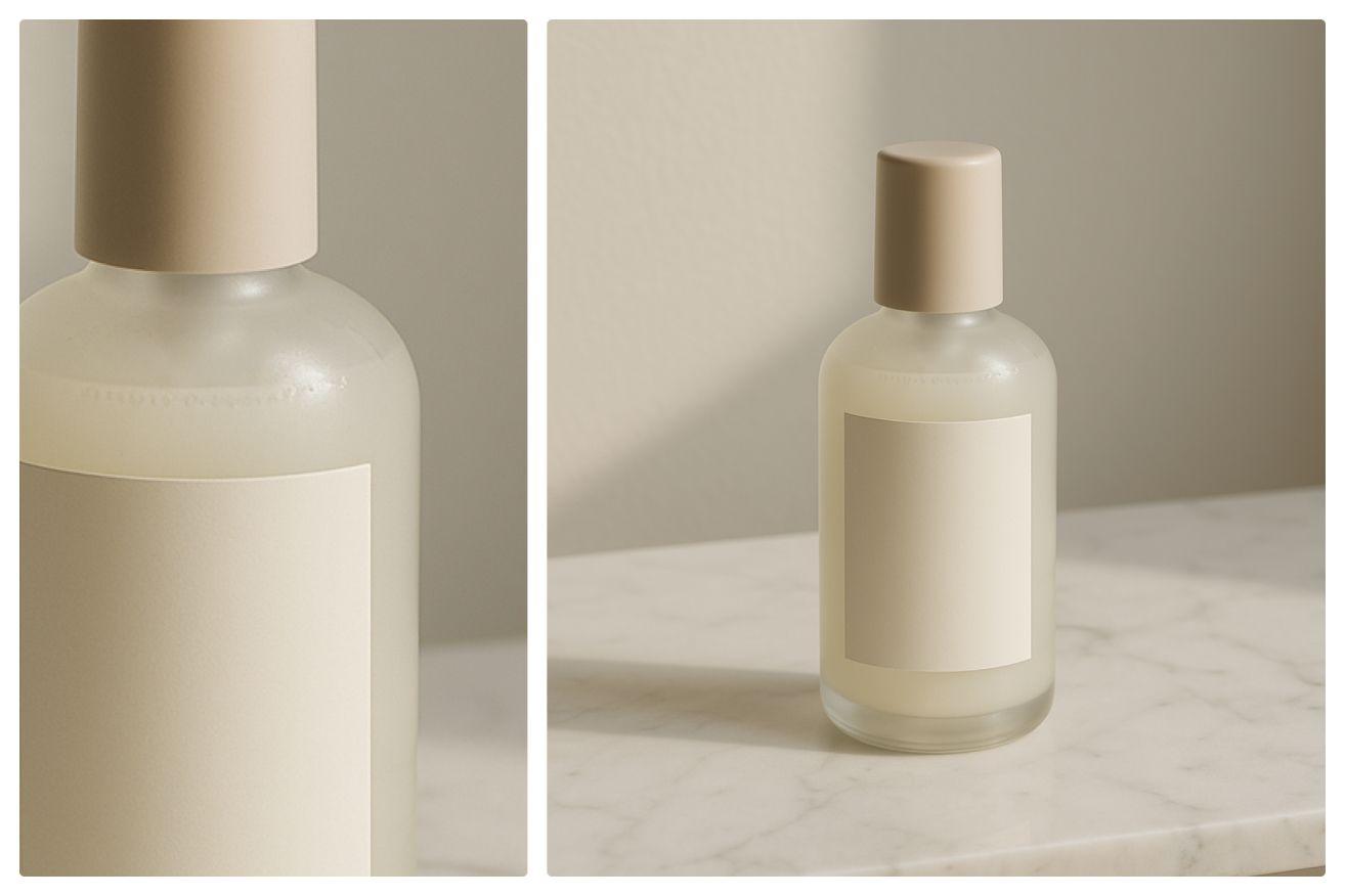 Prompt: A minimalist skincare bottle on a white marble table, soft natural light, neutral tones, clean composition, luxury branding style, simple background, soft shadows.