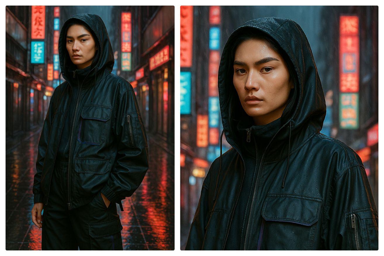 Then we shifted gears and asked for a hyperrealistic fashion editorial: a futuristic streetwear model standing in a neon-lit Tokyo alley. This one came out strong. Good lighting, believable textures, even the reflections on the street were convincing. But, again, on closer inspection, some details — like how fabrics fold, or how faces are structured — didn’t always hold up.