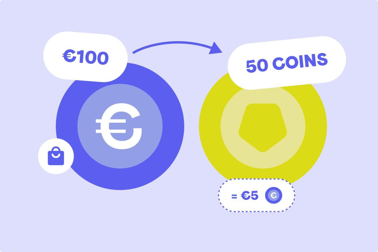 Let's break down the math in a simple way: for every €10 you spend, you'll receive 5 coins. Since each coin is worth €0.10, it's easy to keep track of your rewards. For example, when you make a €100 purchase, you'll receive 50 coins worth €5 that you can use on your next shopping spree.